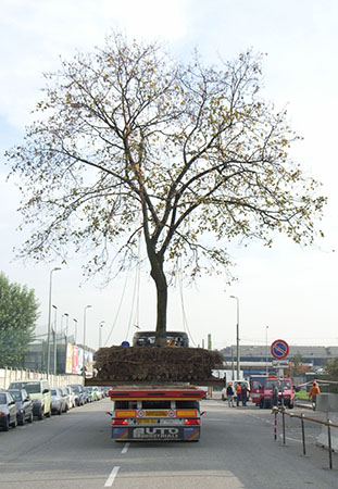 Milano - Parcheggio sotterraneo di via Monte Velino: trasporto di un albero alla nuova dimora