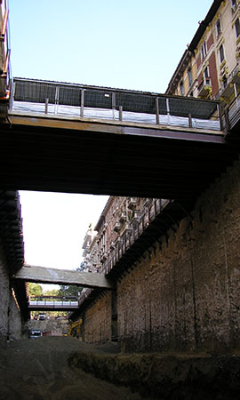 Milano - Parcheggio sotterraneo di via Ozanam: vista dal fondo scavo. Sono visibili gli attraversamenti stradali, il canale irriguo, e le vie di corsa provvisorie