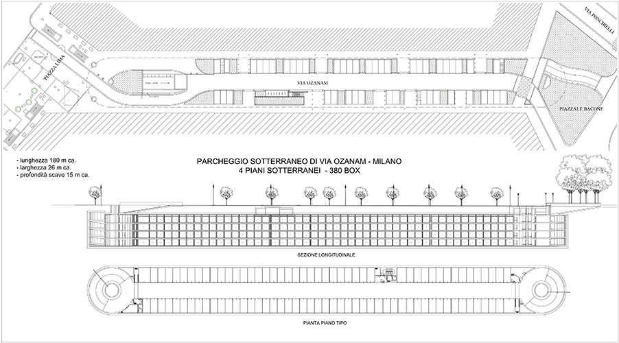 Milano - Parcheggio sotterraneo di via Ozanam: planimetria, sezione e pianta