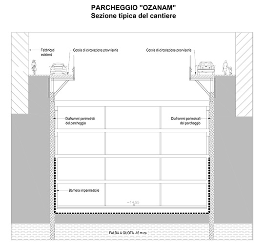 Milano - Parcheggio sotterraneo di via Ozanam: sezione tipica del cantiere